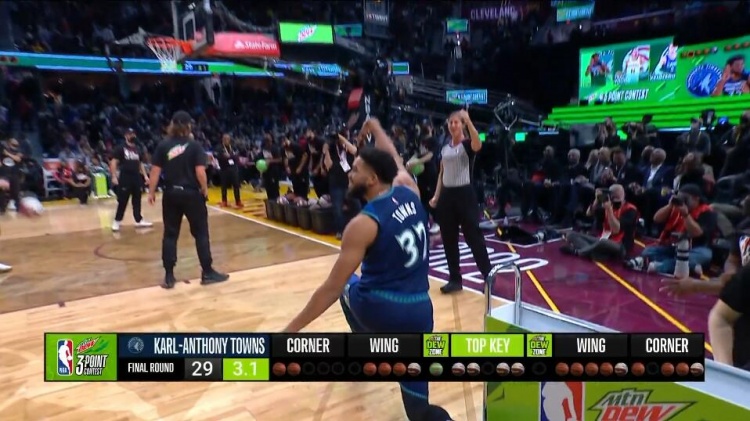 首轮得到22分的唐斯率先出场,一开场他就手感爆棚,前十球共命中9球,最后共得到29分!可惜最后一个点仅命中2球无缘打破库里在全明星上的单轮纪录(预赛31分)。