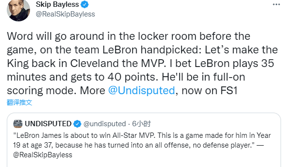 从詹姆斯队和杜兰特队的阵容实力来看,詹姆斯队获胜的机会很大,那么谁会夺得全明星赛MVP呢?名嘴斯基普-贝勒斯表示:这支由詹姆斯精心挑选的球队,赛前,更衣室里会散布着这个消息:让国王回到克利夫兰并成为MVP。我打赌詹姆斯将出场35分钟并得到40分了,他会开启得分模式。