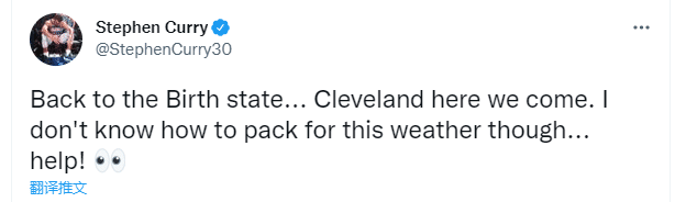 同样是克利夫兰出生的库里也来了,来之前库里发推:“回到出生的地方!克利夫兰我来了。不过我真不知道这天气我需要打包什么行李。