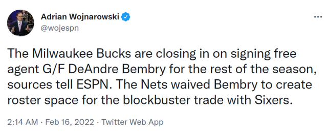 178直播02月16日讯 ,据名记沃纳罗斯基报道,雄鹿已经接近和本布里签约至本赛季结束,此前,篮网为了完成与76人的交易,裁掉本布里腾出阵容名额。据悉,本布里最快在北京时间本周四前往密尔沃基完成签约。