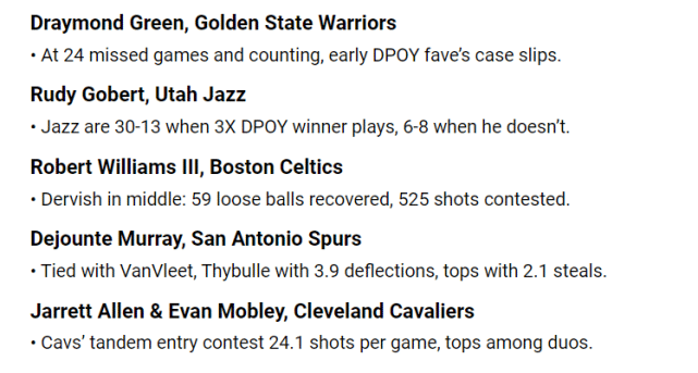 字母哥的出勤率,是他能排在第一的重要原因。格林只打了勇士58场中的34场,阿德巴约打了热火57场中的32场。戈贝尔打了爵士57场中的43场,算是还不错了。字母哥打了58场中的47场,无疑更高。字母哥在场时,雄鹿百回合失分105.1分,而他不在场时,雄鹿百回合失分增至110.3分。雄鹿新援伊巴卡应该会减轻他的防守压力。