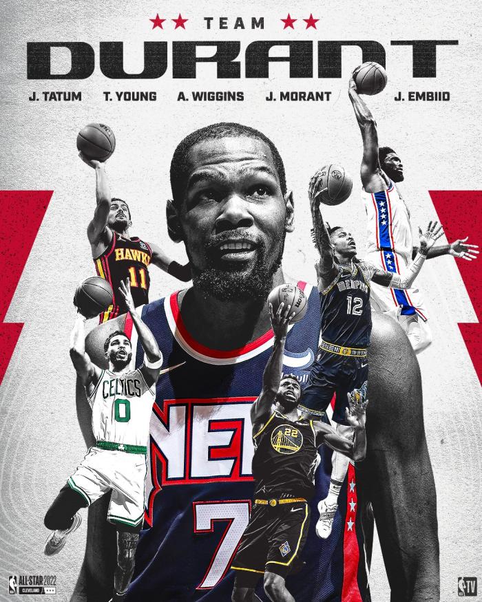 杜兰特队的球星则是恩比德、莫兰特、塔图姆、特雷-杨和维金斯;替补球星是布克、唐斯、拉文、穆雷、米德尔顿、三球和戈贝尔,队长杜兰特因伤无法出战。