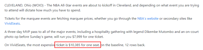 178直播02月16日讯 ,据克利夫兰当地媒体cleveland19.com报道,本赛季全明星正赛的最高票价已超过10000美元,其他各阶段赛事的最低票价也曝光了。