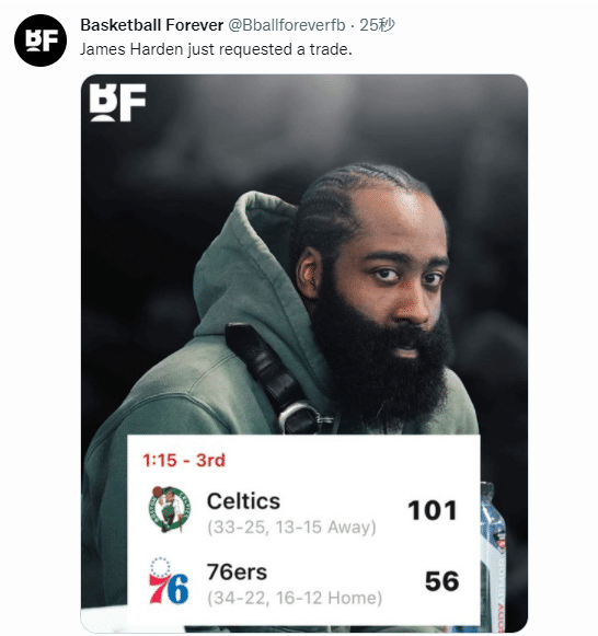 美媒Basketball Forever晒76人第三节落后45分时的画面,发推写道:哈登才主动申请了交易。