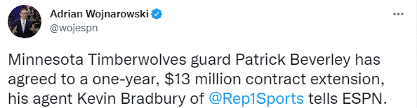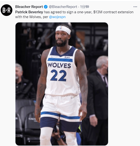178直播02月15日讯 ,据ESPN名记沃纳罗斯基报道,帕特里克-贝弗利已经同意和森林狼提前续签1年1300万美元的新合同,贝弗利的经纪人透露了这一消息。