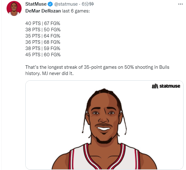 德罗赞连续6场35+创纪录,成为乔丹之后公牛队史第一人,也是仅次于乔丹成为队史第三人;在公牛历史连续35+场次上,1986年乔丹(10次)和1988年的乔丹(7次)占据前二,德罗赞连续6场队史第三。
