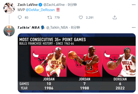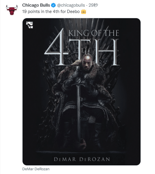 对于德罗赞的疯狂表现,公牛另一球星拉文发推高呼:德罗赞MVP;公牛官方晒德罗赞末节19分,配图直呼德罗赞是末节之王。