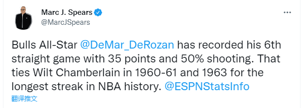 德罗赞连续6场35+且命中率均达到50%,这是乔丹当年也没有做到的,NBA史上只有上古神兽张伯伦做到过,曾在1960-1961赛季和1963年曾两次达此成就。