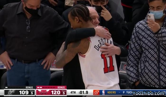 赢球后,德罗赞深情拥抱波波维奇,德罗赞曾在马刺打了三个赛季,去年休赛期,德罗赞离开马刺并且加盟公牛;赛季至今,公牛队战绩出色,4连胜后37胜21负排名东部第二,仅落后热火0.5个胜场。