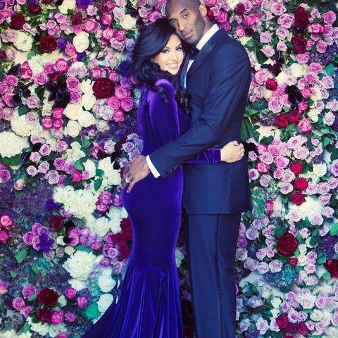 照片上,瓦妮莎身穿紫色长裙,露出灿烂的笑容,而一身西服的科比贴着瓦妮莎,显得温柔体贴。背景墙是多种颜色的玫瑰,相当唯美。
