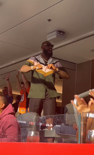 178直播02月14日讯 ,NFL超级碗洛杉矶公羊队和辛辛那提猛虎队,湖人球星詹姆斯现身超级碗现场引欢呼,坐在包厢里观战,当公羊达阵得分时,詹姆斯疯狂庆祝十分抢镜,面带笑容十分激动。