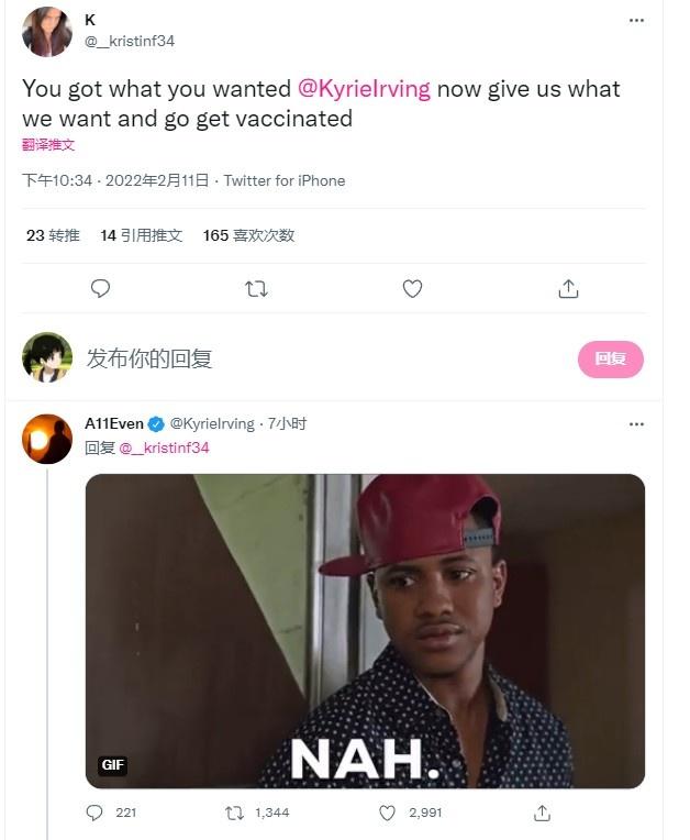 篮网这边看起来目前情况更糟糕,杜兰特还在养伤,欧文依旧我行我素,坚决拒绝打疫苗,意味着他接下来仍只会打客场的比赛。今日他在社媒上与网友互动,其中一位说“你得到了你想要的东西,现在给我们想要的,去打疫苗的”欧文则用一张图片回应“不”哎,好吧!
