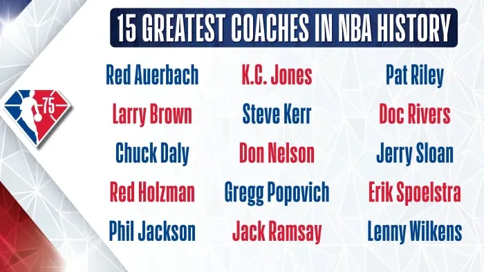 作为联盟75周年赛季的纪念活动之一,NBA官方宣布了历史上15位最伟大教练的评选结果,排名不分先后!我们比较熟悉的禅师、波波维奇、莱利、阿德尔曼、拉里布朗、斯波等人都在列,值得一提的是道格里弗斯也上榜了,他曾带领凯尔特人夺冠,在魔术时期也算是有功绩,但他与那几位相比还是有差距的吧!