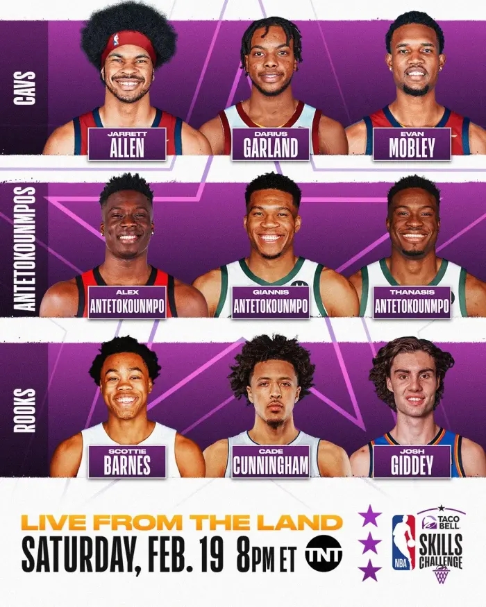 官宣技巧赛名单,分别是:贾勒特-阿伦,加兰,莫布利,新秀巴恩斯,坎宁安,吉迪还有字母三兄弟!一般来说技巧大赛小个子球员有优势,因为他们技巧更纯熟、速率更快。但是这几年大个子球员夺冠的概率似乎更高,技巧大赛需要完成传球、八字运球、上篮和三分。
