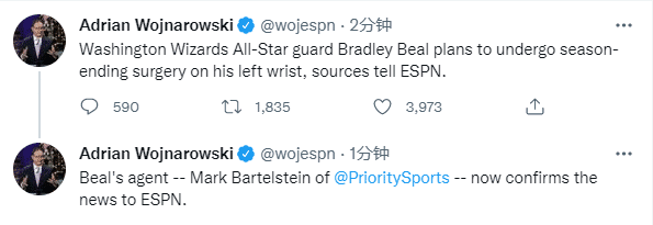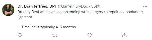 目前奇才24胜29负排在东部第11位,比尔赛季报销,这意味着他们将会彻底摆烂;对于比尔的伤情,医学专家Evan Jeffries发推写道,比尔接受手腕治疗手术,赛季报销,一般休养时间是4-6个月。