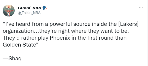 湖人与雄鹿开打赛前,TNT解说员奥尼尔在演播室中谈到了湖人队,奥尼尔表示:我从湖人内部打听到,一个非常权威的消息源透露,湖人对他们现在的排名感到满意。他们宁愿在首轮碰太阳也不愿在首轮打勇士。
