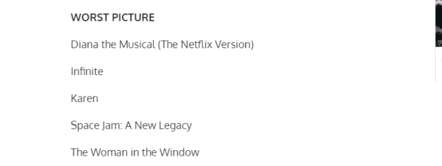 而和《空中大灌篮2》竞争年度最烂影片的包括音乐剧《戴安娜》、《无限》、《卡伦》和《窗外的女人》。
