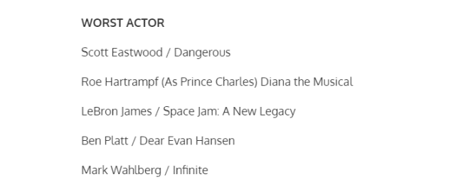 和詹姆斯一起“竞争”最差男主角奖的有《危险》的斯科特-伊斯特伍德、音乐剧《戴安娜》的罗伊·哈特拉姆、《亲爱的埃文汉森》的本-普拉特以及《无限》的马克-沃尔伯格。