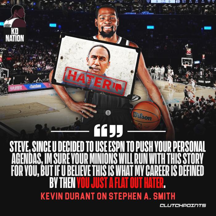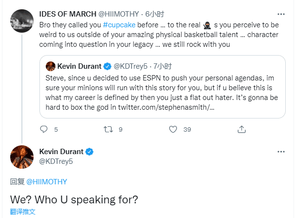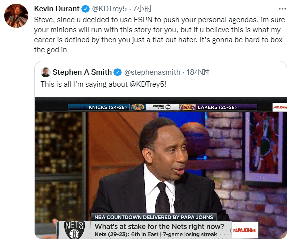 不久前,杜兰特再次发推回应:既然你(A.Smith)决定用ESPN这档栏目来推动你的个人看法,我相信你的小跟班们会为你追踪报道这个看法,但是如果你认为这是对我职业生涯的定义,那么你就是一个彻头彻尾的黑子。要对抗上帝可不容易。