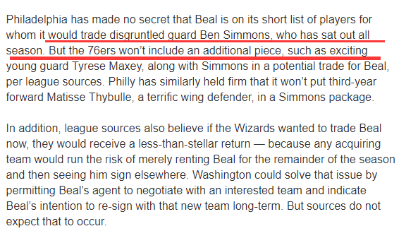 奇才记者David Aldridge撰文写道,76人对奇才球星布拉德利-比尔感兴趣已是公开的秘密;76人愿意用本-西蒙斯去交易比尔,但76人不会在这笔潜在的交易中包含队内其他球员,比如本赛季表现令人兴奋的年轻后卫马克西,而且他们也不会将防守悍将塞布尔打包在西蒙斯的交易中。