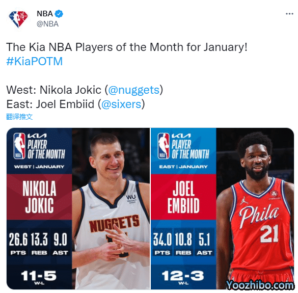 178直播02月03日讯 ,NBA官方正式公布1月份东西部月最佳球员,恩比德场均34+10+5和约基奇场均26+13+9分别当选,大帝创纪录,月最佳新秀名单也公布,吉迪和坎宁安当选并且创纪录。