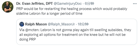 ESPN名记透露在膝盖消肿之前,詹姆斯都不出,除了不做PRP(富血小板血浆)治疗,他们将会探索所有的治疗方案。