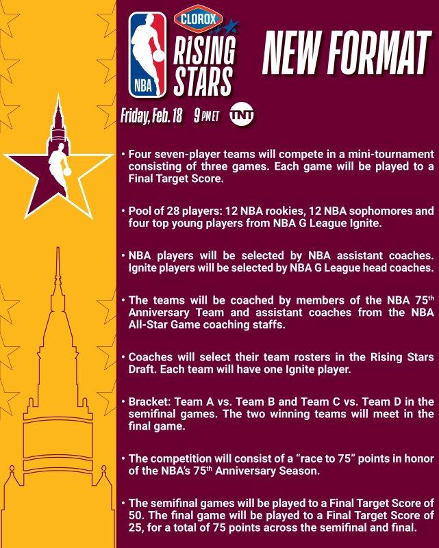 4支球队将先分成两组,分别打两场半决赛,胜方再打一场决赛。比赛的获胜方式,是先达到目标分数的球队获胜。半决赛的目标分数是50分,而决赛的目标分数是25分。最终的冠军,累计将在两场比赛里得到75分,这样的设置是为了纪念NBA75周年。