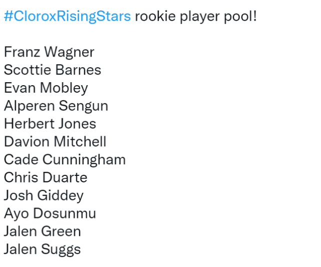 一年级新秀(12人):瓦格纳(魔术)、巴恩斯(猛龙)、莫布里(骑士)、申京(火箭)、赫伯特-琼斯(鹈鹕)、米切尔(国王)、坎宁安(活塞)、杜阿尔特(步行者)、吉迪(雷霆)、多森姆(公牛)、杰伦-格林(火箭)、萨格斯(魔术)。