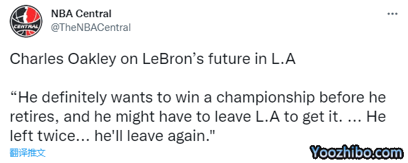 未来詹姆斯还能再次夺冠吗?NBA名宿查尔斯-奥克利谈到詹姆斯在湖人的未来,奥克利表示:他绝对想要在退役前再夺一冠,他可能必须离开洛杉矶才能获得冠军,他已经两次离队,他会再次离开。