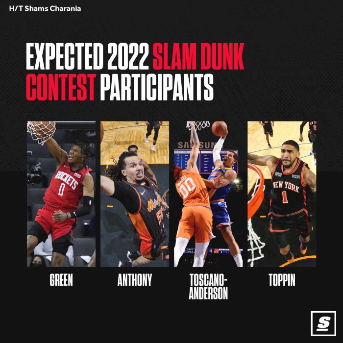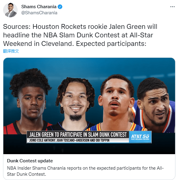 178直播02月02日讯 ,NBA2022年全明星周末扣篮大赛名单曝光,据名记Shams报道,消息人士透露,火箭新秀杰伦-格林、魔术球员科尔-安东尼、勇士球员托斯卡诺-安德森和尼克斯球员托平(第二次参加),预计他们将参加2022年克利夫兰全明星赛扣篮大赛。