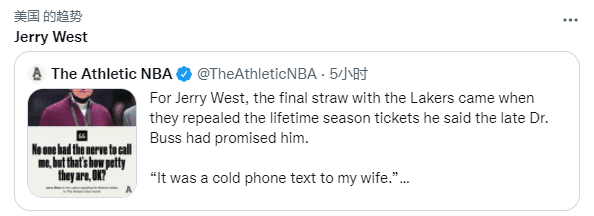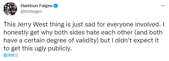 对于韦斯特炮轰湖人管理层这件事,湖人记者Harrison Faigen发推写道:杰里-韦斯特的这件事让所有参与其中的人都无法接受。老实说,我明白为什么双方都恨对方,但我没想到这会在公开场合变得如此丑陋。