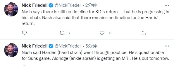 纳什表示杜兰特正在康复中取得进展,但还没有KD复出的具体时间表,纳什还表示乔-哈里斯也没有复出时间表。