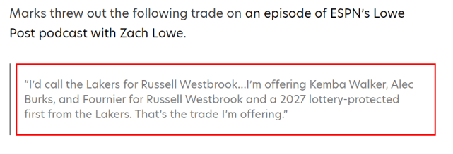“(如果我是尼克斯总经理)我会为了威斯布鲁克给湖人打电话……我愿意提供肯巴-沃克、阿莱克-伯克斯和富尼耶,来换威斯布鲁克和湖人的2027年首轮签(乐透保护)。这会是我愿意做的交易。”