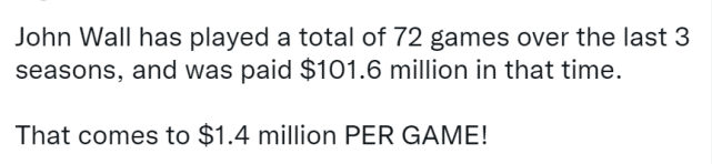 过去3个赛季,沃尔都受到伤病困扰。2018-19赛季,他只打了32场;2019-20赛季报销,一场没打;2020-21赛季,他也只打了40场。打一场比赛,就能赚到140万美元,这确实很夸张,当然,这个赛季的沃尔更是一场没打,就把工资收入囊中。沃尔本赛季的薪水是4431万美元,在全联盟排名前列,但赛季至今,他还没打过一场球。