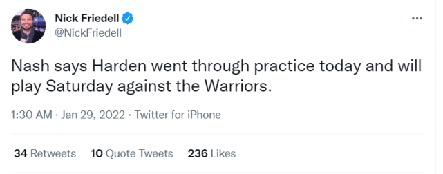 178直播01月28日讯 ,据ESPN记者Nick Friedell报道,篮网主帅纳什确认,哈登参加了今天的训练,并将在明天客场对勇士的比赛中复出。此前对掘金一战,哈登因腿筋紧张缺阵一场,现在看来,伤势并无大碍。