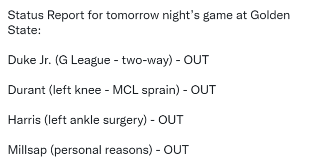 篮网目前遭遇了三连败,排名已经跌至东部第四。不过,对于他们来说,接下来的比赛可能迎来反弹,一波五连客摆在面前,篮网的欧文可以连续出战,而在杜兰特缺阵的情况下,哈登和欧文联手的胜率还不错。篮网记者Chris Miholen写道:“没有KD,而哈登欧文上场的比赛,篮网18胜5负(本赛季2胜2负)。”
