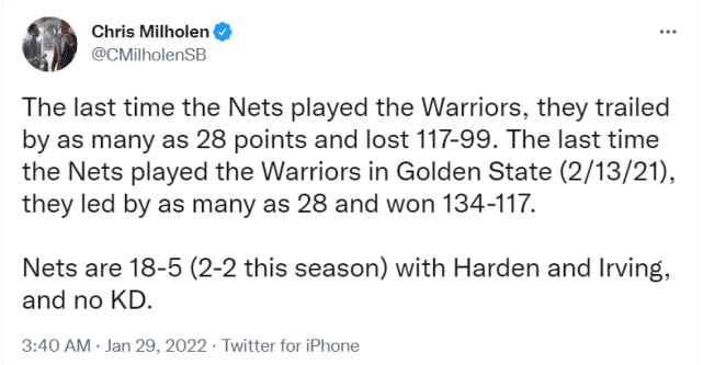 勇士目前36胜13负,排名西部第二。上一次篮网和勇士交锋,他们最多落后28分,并最终以99-117输给对手,而上一次篮网在勇士主场打球,是2021年2月14日,那场比赛,篮网最多领先28分,并最终134-117击败对手。