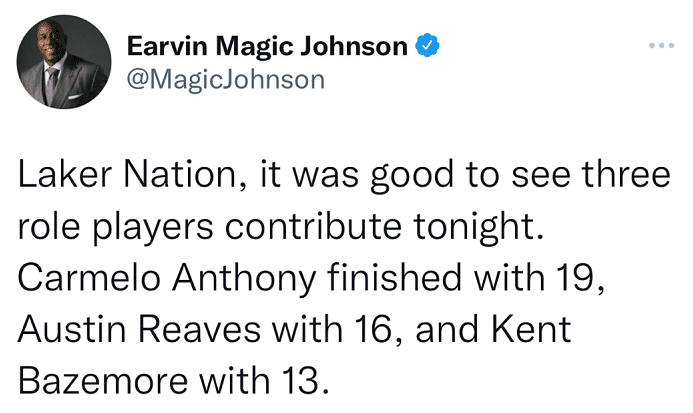 湖人传奇魔术师约翰逊在社交媒体上盛赞威少,称:“威少打出了湖人生涯的最佳表现。35分5助攻4篮板,整场比赛只出现了1次失误。”