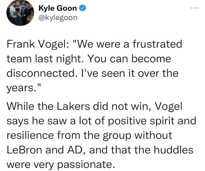 虽然湖人队没有获胜,但沃格尔表示他看到了没有詹姆斯和浓眉哥的球队有很多积极的精神和复原力,而且在一起战斗非常热情。