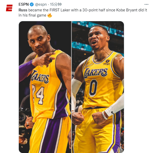 威少全场轰下35分仅仅只有1次失误,得分创湖人生涯新高,下半场30分成为科比退役战后湖人首位做到的球员;虽然威少错失绝杀三分,但神龟虽败犹荣,下半场扛起重担,单核带领湖人打出韧性;威少打出湖人生涯最佳一战。