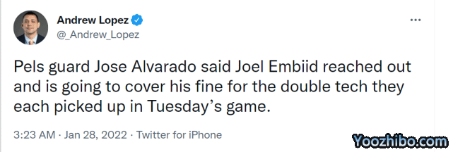 178直播01月28日讯 ,据NBA记者Andrew Lopez报道,鹈鹕后卫阿尔瓦拉多透露,76人中锋恩比德已经和他联系,将为他支付上一场比赛技犯的罚款。两人曾在上次交锋中发生口角,裁判当时给了双方技术犯规。一个球员愿意为发生冲突的对手掏钱,这还真是太罕见了!