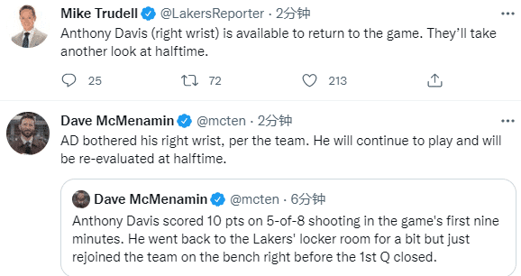 首节比赛,浓眉上场8分钟8投5中高效轰下10分2篮板;此前浓眉因左膝韧带扭伤连续缺席17场比赛,伤愈复出首战帮助湖人击败篮网;对于浓眉的伤势,湖人官方表示浓眉第二节会继续打,中场休息时再次进行伤势评估。