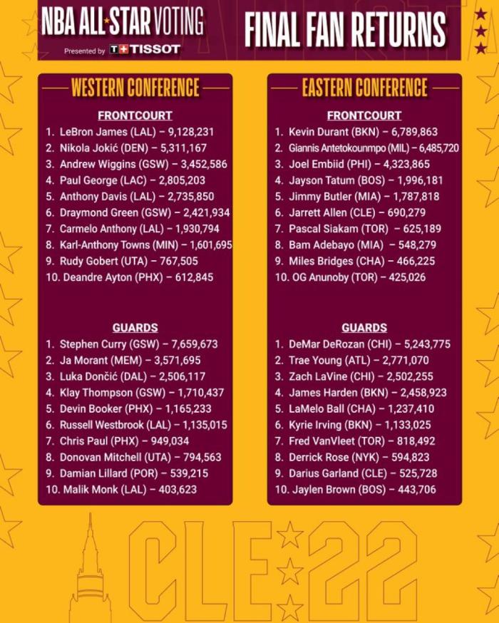 178直播01月28日讯 ,NBA 2022年全明星球迷投票的最终结果出炉,湖人巨星詹姆斯9128231完胜库里和杜兰特再次当选全明星票王;詹姆斯18次全明星9次票王以及5次队长,票数再创历史新高,9次票王追平乔丹并列历史第一。