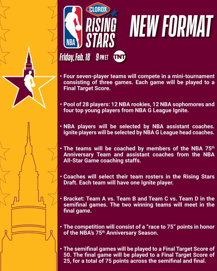 每支球队的教练组成员将由NBA官方历史75大球星和今年全明星教练组的助教组成。每支球队将在选秀活动中选择7名球员,且必须包括一名发展联盟点燃队球员,中国球员曾凡博有望参加新秀挑战赛。
