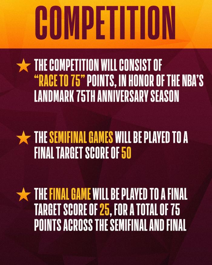 全新模式为,比赛将分为4支由七名球员组成的小队,进行总共3场比赛的锦标赛,分别为2场半决赛和1场决赛。每场比赛都会设定一个最终胜利分数,半决赛的最终胜利分数分别为50分,决赛的最终胜利分数为25分,两轮比赛最终胜利分数总和为75分,纪念联盟75周年。