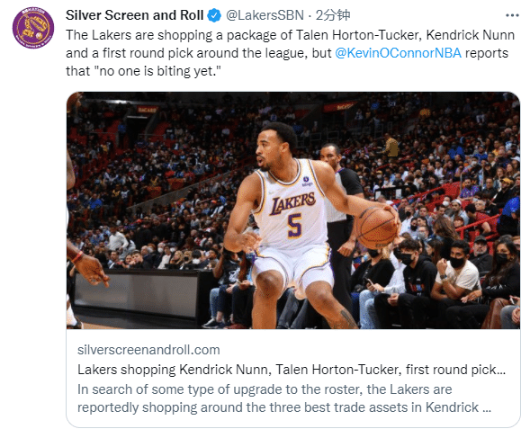 据美媒报道,湖人正在兜售霍顿-塔克、纳恩和2027年首轮选秀权,但没有球队对他们感兴趣。