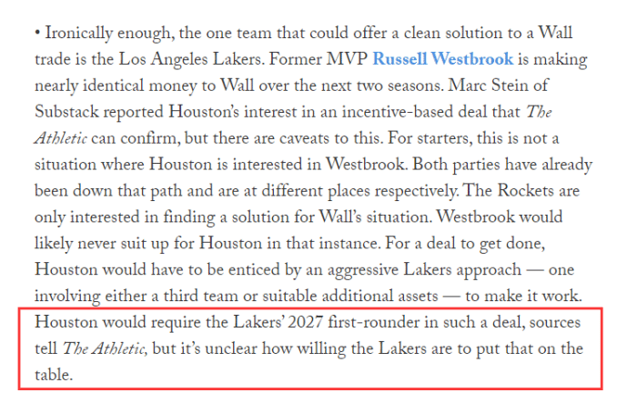 很明显,火箭想用沃尔作为交易筹码,从湖人得到威少和2027年首轮选秀权。
