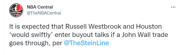 名记Marc Stein进一步报道,消息人士透露,若威少和沃尔互换的交易达成,预计火箭很快会买断威少。