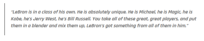 帕特-莱利表示:勒布朗的地位应该独自一档,绝对是独一无二的;他像迈克尔-乔丹,他像魔术师(约翰逊),他像科比,他像杰里-韦斯特,他像比尔-拉塞尔,你把所有这些伟大的球员(的天赋)混合在一起,勒布朗就像把他们的天赋综合在一起。