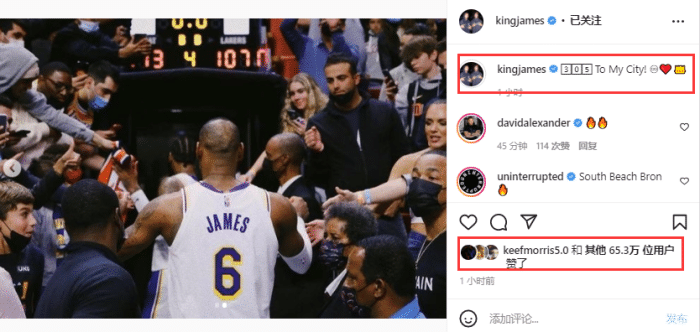 不久前,詹姆斯晒出昨天到迈阿密美航中心球馆打比赛的画面,晒照并且写道:致我的城市;热火官方回复:永远的爱意,冠军!
